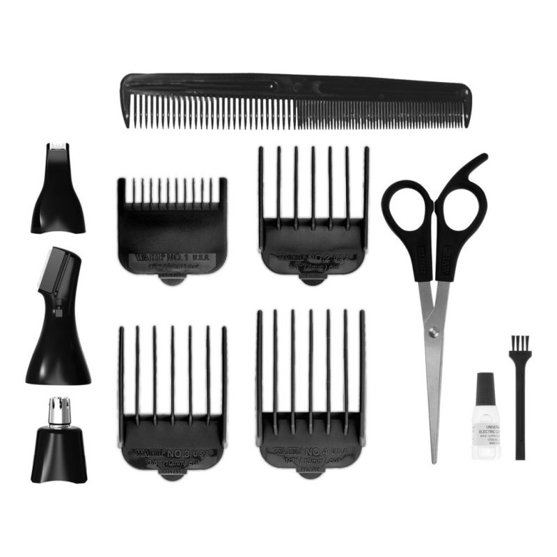 - Includes: 4 guide combs (No 1: 3mm, No 2: 6mm, No 3: 10mm, No 4: 13mm), comb, scissors and 2 extra heads for the trimmer, storage bag, oil and cleaning comb